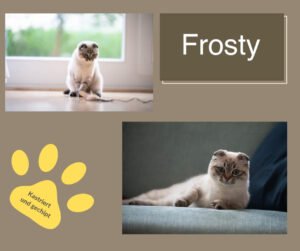 Frosty ist am liebsten immer im Mittelpunkt und liebt Menschen und kuscheln. Sie hat eine Fehlbildung an einer Pfote, diese stört sie aber im Alltag nicht. Sie ist eine verspielte junge Katze mit viel Lebensfreude. Sie sollte aber nur in der Wohnung gehalten werden.